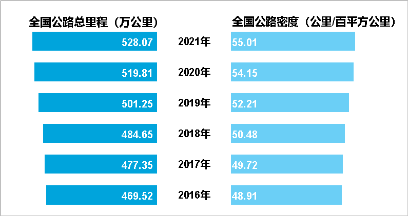 圖2 2016-2021年年末全國(guó)公路總里程及公路密度