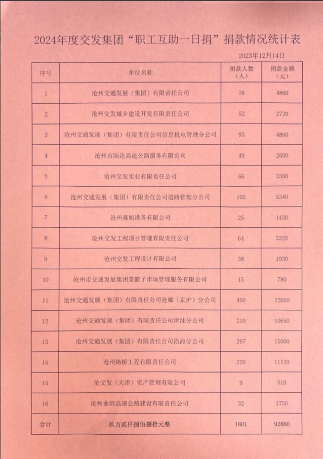 開展“職工互助一日捐”活動,是全市各級工會組織深入貫徹落實習近平新時代中國特色社會主義思想和中國工會十八大精神,積極協(xié)助黨和政府解決民生問題,維護職工穩(wěn)定的一項具體舉措。滄州交通發(fā)展(集團)有限責任公司根據(jù)滄州市總工會辦公室《關于開展 2024 年度“職工互助一日捐”活動的通知》,于2023年12月,組織開展了2024年度“職工互助一日捐”活動。