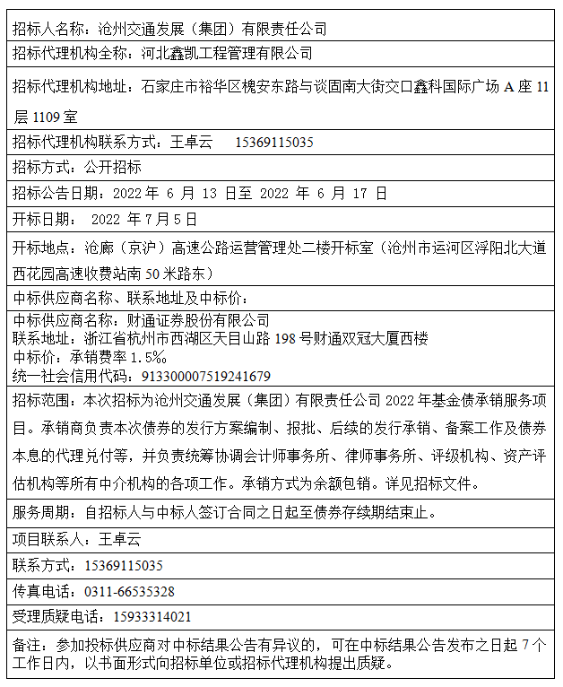 滄州交通發(fā)展(集團(tuán))有限責(zé)任公司2022年基金債承銷服務(wù)項(xiàng)目 中標(biāo)結(jié)果公告