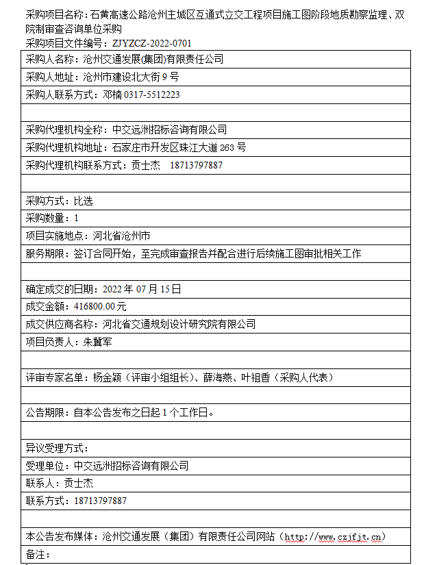 石黃高速公路滄州主城區(qū)互通式立交工程項(xiàng)目施工圖階段地質(zhì)勘察監(jiān)理、雙院制審查咨詢單位采購成交結(jié)果公告